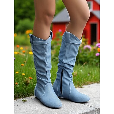女性用カジュアル スラウチブーツ - 普段使いや旅行に最適な、サイドジッパー付きのソフトデニムミッドカーフブーツ