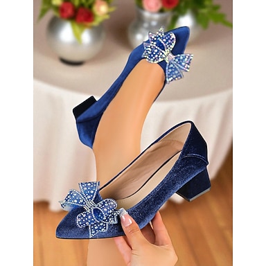 ラインストーンのリボンが付いたレディースのブルーベルベットブロックヒールパンプス - イブニングパーティー、結婚式、フォーマルな機会に最適なエレガントなヴィンテージスクエアトゥヒール