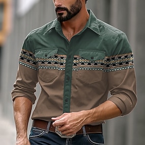 男性用 カラーブロック ウエスタンシャツ ボタンアップシャツ カウボーイシャツ 長袖 ヴィンテージ 西洋料理 日常着 春 秋 冬 折襟 襟付きシャツ 3Dプリント ブラウン