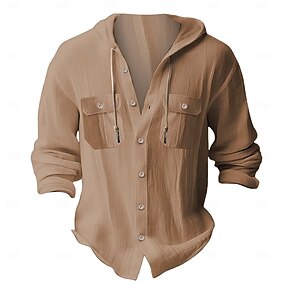 男性用 シャツ ホワイトコットンシャツ カジュアルシャツ ボタンアップシャツ コットンシャツ 平織り バケーション ストリート ブラック ホワイト ダークネイビー ブルー 長袖 フード付き 春 衣類 ポケット