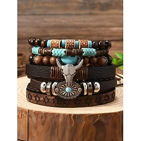 ターコイズストーン、牛の頭蓋骨デザイン、カジュアルやアウトドアに最適なボヘミアンスタイルのメンズレザービーズウエスタンブレスレットセット