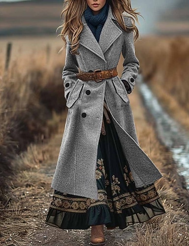 女性用 コート 保温 快適 ポケット ボタン ファッション 平織り お出かけ 週末 ダブルブレスト ロング 折襟 レギュラー 長袖 アウターウェア コーヒー 秋 冬