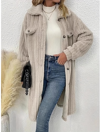 女性用 冬物コート シェルパジャケット 快適 高通気性 ポケット ボタン カジュアル 平織り バケーション ストリート カジュアル デイリーウェア シングルブレスト ロング 折襟 レギュラー 長袖 アウターウェア ブラウン カーキ色 グレー 春 秋