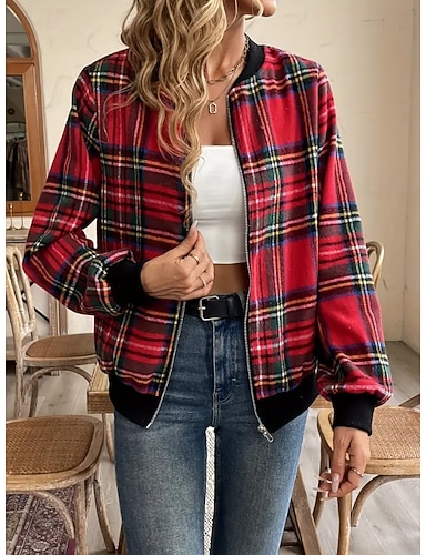 女性用 カジュアルジャケット 保温 速乾性 ジッパー ポケット エレガント ファッション 日常 シンプル 幾何学模様 バケーション カジュアル 日常 祝日 レギュラー 野球の襟 レギュラー 長袖 アウターウェア ルビーレッド ダックレッド 秋 冬