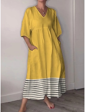 女性用 ミディドレス サンドレス A ラインドレス 旅行度假风 カジュアル ボヘミアン お出かけ ビーチ グラフィック 幾何学模様 七分袖 Vネック イエロー オフホワイト 夏 春