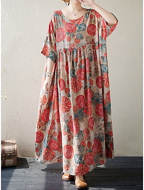 女性用 マキシドレス コットンリネンドレス カジュアルドレス ベーシック カジュアル バケーション 日常 レギュラー グラフィック ハーフスリーブ クルーネック ルビーレッド グリーン 夏