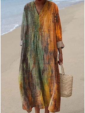ウィメンズミディドレス Vネック ロングスリーブ カフタン 軽量 ルーズフィット Aラインドレス カジュアル ボヘミアン パーティー ルーズフィット オンブレ グラフィック 幾何学的 ロングスリーブ Vネック イエロー ブルー オレンジ ブラウン 秋