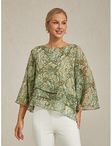 レディースブラウス グリーン ペイズリー 花柄 レイヤード 7分袖 ゆったり ラウンド ボートネック カジュアル エレガント 春 夏