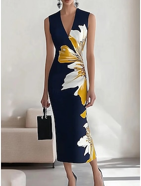 女性用 マキシドレス シースドレス カジュアル アウトドア お出かけ レギュラー フラワー ノースリーブ Vネック 海軍 ブラック 夏