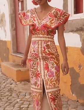 レディース グラフィック カラーブロック バックレス スプリット 太もも V ネック フラッタースリーブ ミディドレス エレガント スタイリッシュ デート バケーション ノースリーブ 夏