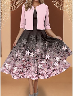 ジャケット付きレディースツーピースドレスセット ミディドレス エレガントAラインドレス 半袖 プリントドレス フローラルプリント クルーネック デイリー ピンク 春 秋 レギュラーフィット