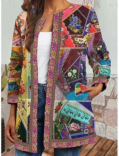 女性用 冬物コート カジュアルジャケット 保温 速乾性 ポケット オープンフロント 近代の フラワー カジュアル 日常 カジュアル/普段着 ショート クルーネック レギュラー 長袖 アウターウェア ルビーレッド ネイビーブルー グリーン 春 秋