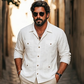 男性用 シャツ リネンシャツ グアヤベラシャツ サマーシャツ ビーチシャツ ボタンアップシャツ 平織り バケーション カジュアル ホワイト 長袖 キャンプカラー 夏 春 衣類 ポケット