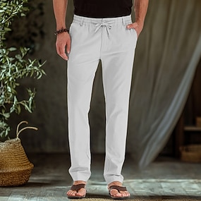 男性用 リネンパンツ ズボン サマーパンツ ビーチパンツ ドローストリング 弾性ウエスト まっすぐな足 平織り 履き心地よい 高通気性 全長 カジュアル 日常 祝日 旅行度假风 ファッション ホワイト スカイブルー