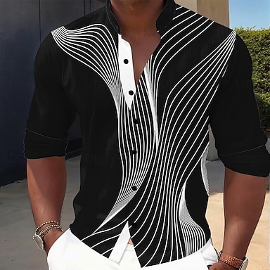 男性用 幾何学模様 ライン 抽象芸術 シャツ ボタンアップシャツ スタンドカラーシャツ 長袖 カジュアル アウトドア バケーション 日常 春 秋 スタンドカラー Band Collar 3Dプリント リネンライクシャツ ブラック