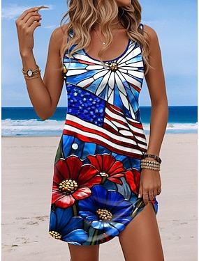 女性用パトリオット パトリオティック ベテランドレス ミニドレス Aラインドレス サマードレス オフショルダードレス バケーション カジュアル デイリー ルーズフィット グラフィック フラッグ ノースリーブ Uネック 青 夏