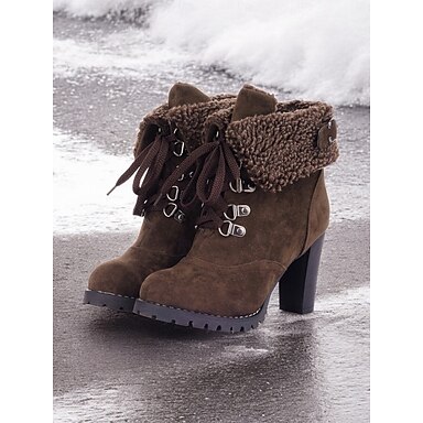 女性用フェイクスエードハイヒール冬用ブーツ - 雪や寒い天候に適したチャンキーヒールのファー裏地付きレースアップブーツ