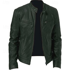 男性用 レザージャケット トランジションジャケット バイカージャケット 赤い革のジャケット バケーション 日常 防風 保温 ポケット 秋冬 平織り ファッション クラシック スタンド レギュラー 合皮 シルバー ブラック ホワイト ワイン ダークグリーン ジャケット