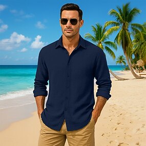 男性用 シャツ サマーシャツ カジュアルシャツ ビーチシャツ ボタンアップシャツ シアサッカーシャツ ブラック ルビーレッド ダークネイビー ネイビーブルー ダークグリーン 長袖 純色 平織り カラー バケーション カジュアル 衣類 ファッション カジュアル 快適