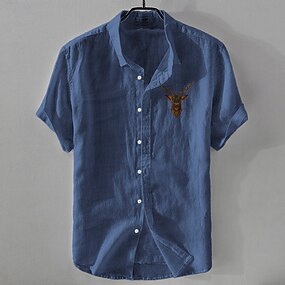 男性用 リネンシャツ カジュアルシャツ コットンリネンシャツ ボタンアップシャツ アニマル柄 バケーション デイリーウェア ホワイト ダークネイビー スカイブルー カーキ色 半袖 ラペル オールシーズン 衣類 バックル