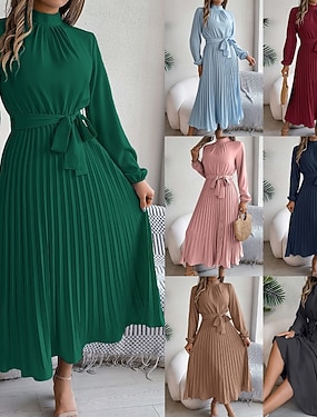 女性用 ミディドレス 二次会ドレス / カクテルドレス サテンドレス フォーマルドレス エレガントなドレス エレガント ファッション 近代の アウトドア オフィス レギュラー 平織り 長袖 クルーネック ワイン グリーン 秋 冬