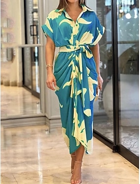 女性用 Tシャツドレス サマードレス プリントドレス フラワー リーフ柄 フリル ボタン シャツカラー ロングドレス マキシドレス エレガント ファッション ワーク 日常 半袖 レギュラー イエロー ピンク ルビーレッド 夏 春 S M L XL XXL