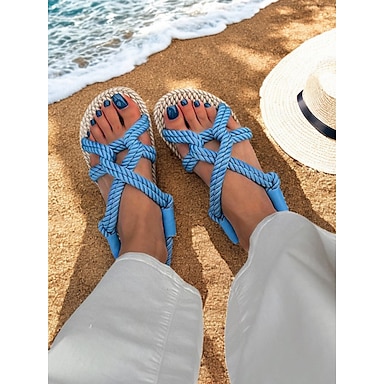女性用ブルーロープサンダル - 夏、ビーチでの休暇、カジュアルウェアに最適な、手作りの結び目のあるストラップ付きフラットサンダル