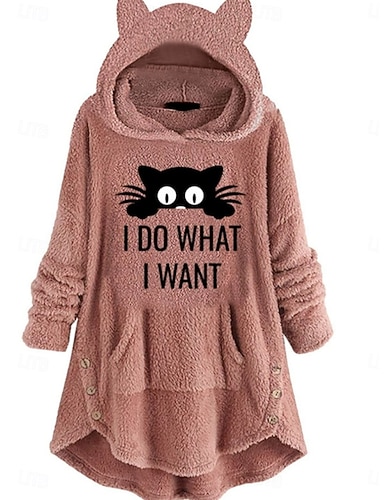 女性用 プルオーバー フーディー スウェットシャツ 猫 レタード カジュアル 長袖 フード付き ロングトップス ストリート 日常着 カジュアル ピンク ワイン グレー 秋 冬