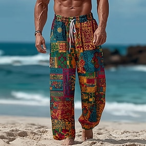 男性用 幾何学模様 倫理/アフリカ ズボン バギーパンツ カジュアルパンツ ミディアムウエスト ヴィンテージレトロ アウトドア バケーション 伸縮性のあるドローストリングウエスト ポケット付きリネン風パンツ 夏 春 秋 3Dプリント ブラック ブラウン ダークブルー
