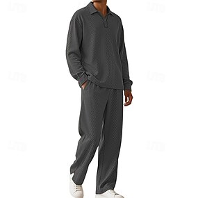男性用 ワッフルポロシャツ ゴルフシャツ ストリート カジュアル ラペル 長袖 ベーシック 近代の 平織り テクスチャード加工 ボタン 春 秋 オールシーズン レギュラー ブルーグレー ブラック ホワイト イエロー バーガンディー グレー ワッフルポロシャツ