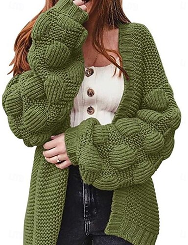 女性用 カーディガン エレガント ファッション 日常 純色 オープンフロント ニット テクスチャード加工 長袖 ロングトップス ニット ワーク グリーン ダックパープル 秋 冬