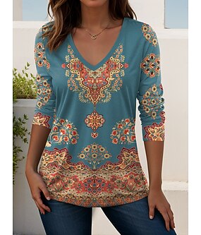 女性用 シャツ ブラウス フラワー ボヘミア 日常 レトリ/ヴィンテージ 長袖 Vネック レギュラートップス 日常 プリント ワイン フクシャ グリーン 夏 春