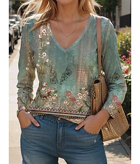 女性用 Tシャツ フラワー グラフィック エレガント ヴィンテージ ファッション 長袖 Vネック レギュラートップス 日常 週末 プリント ピンク ブルー パープル グリーン 春 秋