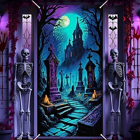 Halloween ポスター ドアカバー 屋外バナー 墓地 3D ダークパンクゴシック パーティー 寮 ティーンズルーム 大学寮 男の隠れ家フラットベッドルーム 撮影背景 ホームデコレーション