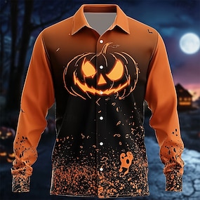 Halloween 男性用 カボチャ 3Dカトゥーン ハロウィーンコスチューム シャツ スタンドカラーシャツ 長袖 ダークゴシックスタイル アウトドア 祝日 春 秋 スタンドカラー Band Collar ボタンダウン リネンライクシャツ オレンジ