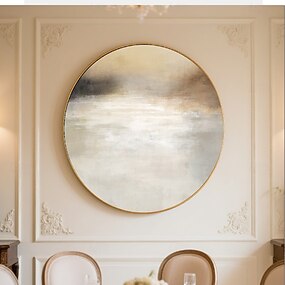 手作りの円形抽象油絵、金色のフレーム、反射グラデーションアートワーク、グレー、ホワイト、ベージュ、落ち着いたゴールド、チャコールトーン、モダンな壁装飾、豪華な家庭的な雰囲気、すぐに掛けられる、内側のフレーム付き