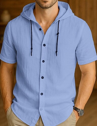 男性用 ボタンアップシャツ フード付きシャツ ブラック ホワイト カーキ色 グレー ライトブルー 半袖 単色/無地 フード付き バケーション カジュアル フード付き 衣類 ポリエステル ファッション