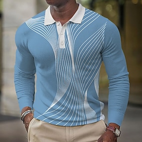 男性用 幾何学模様 ライン ポロ 長袖 ポロシャツ ラペル ビジネスカジュアル アスレイジャー デイリーウェア ポケット 3Dプリント ボタン 春 秋 レイクブルー ブルー グリーン