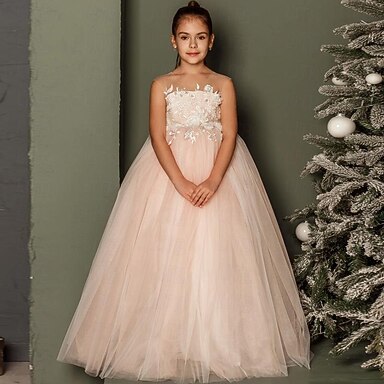 フラワーガールドレス キッズ 女の子 プリンセスドレス 性能 結婚式 パーティー エレガント 美しい メッシュ フラワー ノースリーブ クルーネック ホワイト ピンク 4年以上
