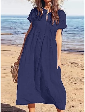 女性用 ブラック ワイン ネイビーブルー 夏 春 マキシドレス コットンリネンドレス カジュアルドレス コットンサマードレス ベーシック 近代の 日常 週末 ルーズフィット 平織り クルーネック