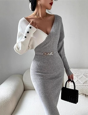 女性用 ミディドレス セータードレス カジュアルドレス ボディコン エレガント ファッション 近代の 日常 デート 週末 レギュラー カラーブロック 長袖 ディープVネック ブラック アプリコット グレー 秋 冬