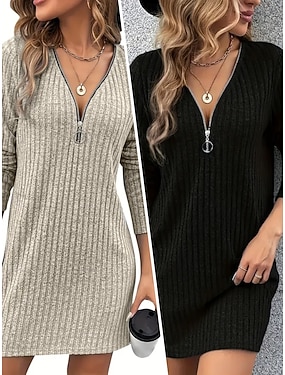 女性用 ミニドレス ニットワンピース カジュアルドレス 冬のドレス ファッション 近代の 日常 デート 週末 レギュラー 平織り 長袖 Vネック ブラック アプリコット 春 秋 冬