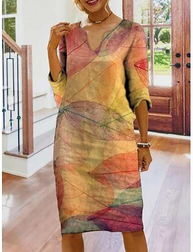ウィメンズ ミディドレス Vネック 長袖 カフタン 軽量 ルーズフィット Aラインドレス カジュアル ボヘミアン パーティー ルーズフィット グラフィック ジオメトリック 長袖 Vネック イエロー ピンク ブルー オレンジ 秋