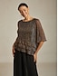 女性用 ブラウス ドレッシーなトップス ゆったりとしたトップス シフォントップス エレガント ヴィンテージ スタイリッシュ 七分袖 クルーネック ボートネック ワーク 日常 デートの夜の服装 スパンコール プリーツ パッチワーク ブラウン 春 秋