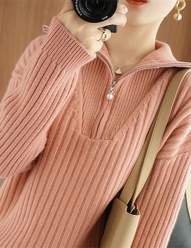 女性用 ニット プルオーバー ファッション ベーシック カジュアル ピュアカラー リブ ハーフジッパー ジッパー ニット 長袖 レギュラートップス ニット アウトドア 日常 週末 ピンク 秋 冬