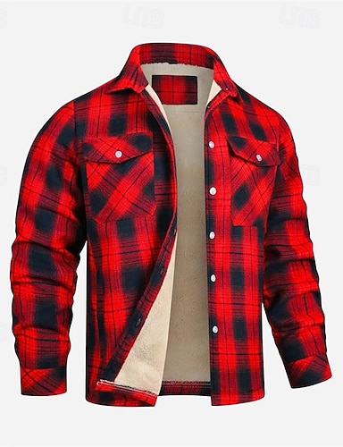 男性用 冬物ジャケット シャツジャケット フリースの上着 カジュアルジャケット バケーション 日常 保温 ポケット フリース 秋 冬 チェック ファッション ストリートファッション ラペル レギュラー ブラック ルビーレッド オレンジ グリーン ジャケット