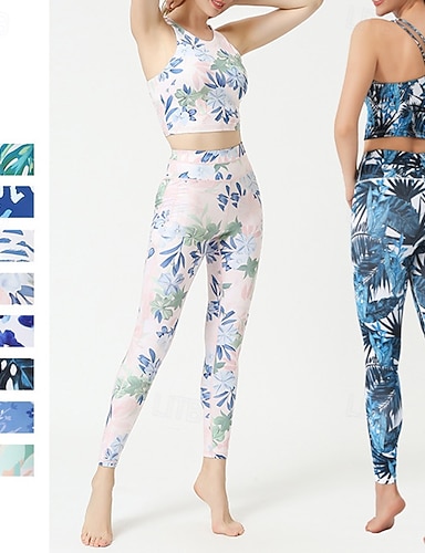 女性用 2個 アクティブウェアセット スポーツブラ シームレスレギンス プリント スーツウェア 夏 ピンク ブルー ジム アスレチック ピラティス ハイウエスト 透けない おなかコントロール ノースリーブ スポーツ アクティブウェア タイトフィット