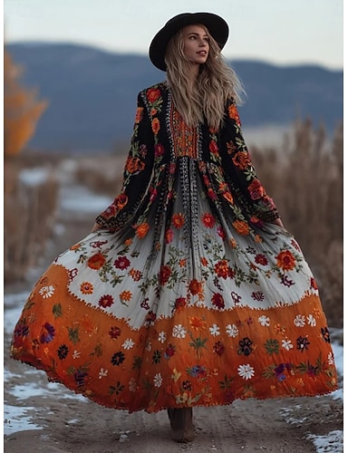 女性用 マキシドレス プリーツドレス パーティー カジュアル ボヘミアン 日常 デート お出かけ レギュラー フラワー グラフィック 長袖 Vネック オレンジ 秋 冬