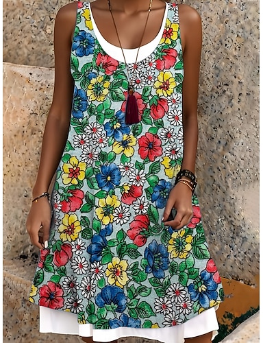 女性用 ミニドレス カジュアルドレス 花柄ドレス プリントドレス クラシック 近代の アウトドア バケーション 祝日 レギュラー フラワー ノースリーブ Uネック グレー 夏