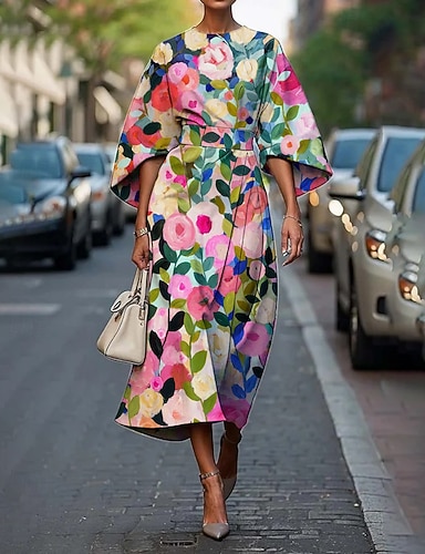 女性用 ミディドレス 花柄ドレス プリントドレス エレガント ファッション アウトドア バケーション お出かけ レギュラー フラワー ハーフスリーブ クルーネック ピンク ピーチ グリーン ダークブルー 夏